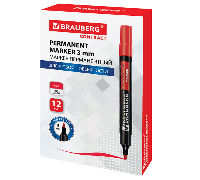 Простой и надежный маркер BRAUBERG «Contract» для повседневного использования. Предназначен для письма на любой поверхности: бумага, полиэтилен, дерево, стекло, металл, натуральная кожа, ткань, камень, плитка. Особая нестираемая основа перманентного маркера обеспечивает такие качества, как стойкость к воздействию воды, ультрафиолета, низких и высоких температур. Цвет колпачка соответствует цвету чернил. Фетровый наконечник обладает повышенной износостойкостью и обеспечивает экономный расход чернил. Отличается продленной линией письма.Изделие не перезаправляется. Плотно закрывается колпачком, что предотвращает высыхание наконечника и чернил. Толщина линии письма - 3 мм. Спиртовая основа быстросохнущих чернил. Круглая форма корпуса из пластика, диаметр которого 15 мм. Цвет чернил: красный. Количество в комплекте: 1 шт.. Форма наконечника: круглый. Минимальная толщина линии письма: 3 мм. Максимальная толщина линии письма: 3 мм. Серия: Contract. Подходит для левшей: да. Водостойкие чернила: да. Повышенная светостойкость: да. Быстросохнущие чернила: да. Наконечник устойчив к повреждению и истиранию: да. Форма корпуса: круглая. Диаметр корпуса: 15 мм. Материал корпуса: пластик. Основа чернил: спиртовая. Упаковка: картонная коробка. Бренд - BRAUBERG. Производитель - Китай.