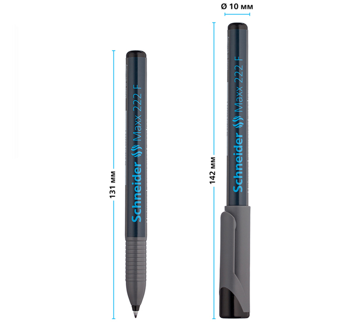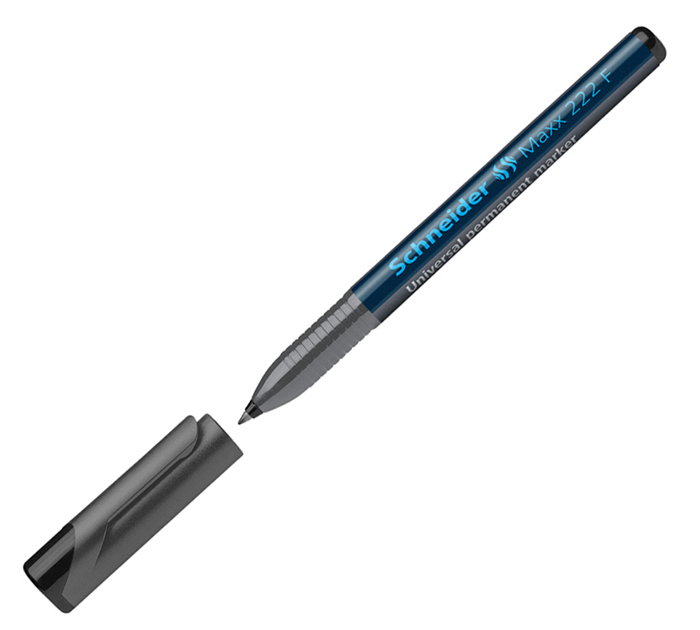 Маркер перманентный Schneider Maxx 222F с чернилами на спиртовой основе подходит для письма на большинстве твёрдых поверхностей, включая картон, бумагу, металл, стекло, дерево и пластик. Круглый корпус маркера диаметром 10 мм выполнен из пластика. Толщина линии письма составляет 0,7 мм. Маркер может находиться без колпачка до 3 дней и не высыхает. Надписи быстро сохнут, не выцветают и не размываются. Цвет колпачка соответствует чёрному цвету чернил. Страна-производитель - ГЕРМАНИЯ