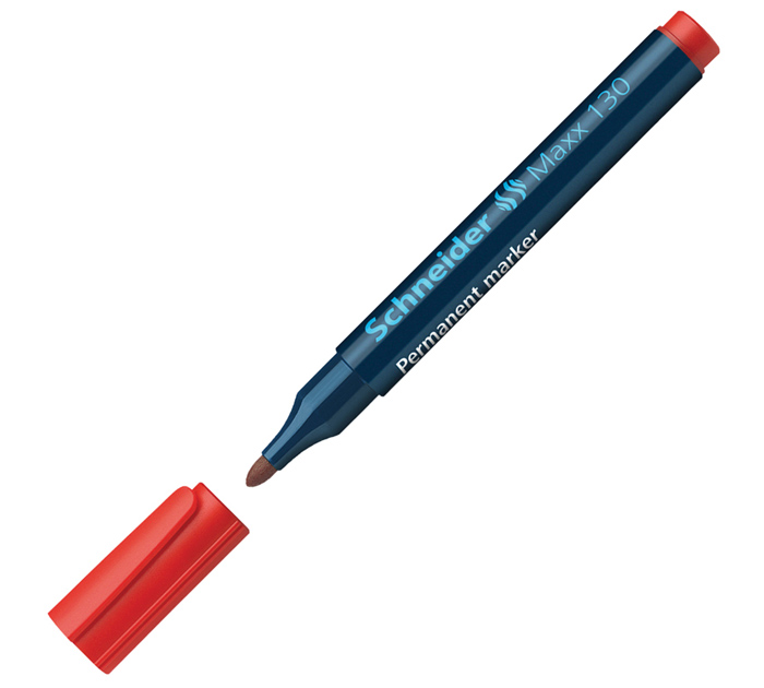 Перманентный маркер Schneider Maxx 130 с чернилами на спиртовой основе подходит для большинства твёрдых поверхностей. Маркер представлен с пулевидным пишущем узлом. Цвет чернил - красный, толщина линии 1-3 мм. Изделие может находиться без колпачка до 3 дней и не высыхать. Надписи не выцветают и не размазываются. Безопасен для использования и не содержит ксилол и толуол. Плотный колпачок с клипом надёжно предотвращает высыхание. Цвет колпачка соответствует цвету чернил. Круглый корпус маркера диаметром 14 мм выполнен из пластика.