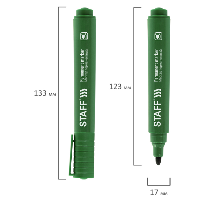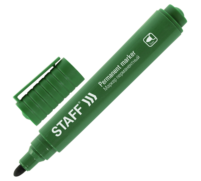 Перманентный маркер STAFF «Basic Budget PM-125» отлично подходит для повседневного использования. Предназначен для письма на любой поверхности: бумага, полиэтилен, дерево, стекло, металл, натуральная кожа, ткань, камень, плитка. Маркер перманентный зеленого цвета обладает круглым корпусом, диаметр которого 17 мм и длина 133 мм. Толщина линии письма - 3 мм. Особая нестираемая основа перманентного маркера обеспечивает такие качества, как стойкость к воздействию воды, низких и высоких температур. Благодаря спиртовой основе чернила быстро сохнут и не размазываются. Износостойкий наконечник устойчив к повреждениям и обеспечивает экономный расход чернил. Изделие не перезаправляется. Плотный колпачок с клипом предотвращает высыхание наконечника и чернил. Цвет корпуса и колпачка соответствует цвету чернил.Это товар эконом-сегмента, поэтому он отличается привлекательной ценой. Товар обладает базовым набором характеристик и простой упаковкой, при этом полностью соответствует основным требованиям потребителей. Страна-производитель - Китай