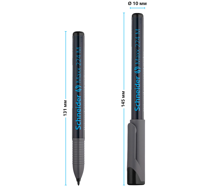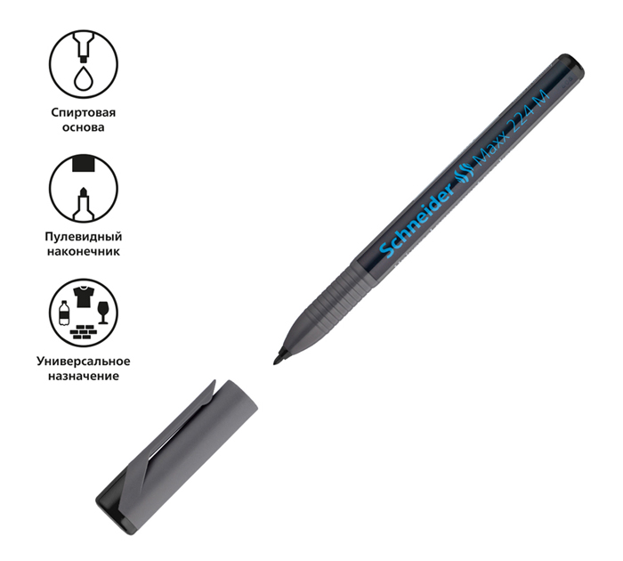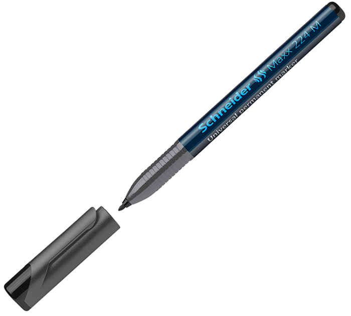 Маркер перманентный Schneider Maxx 224 M с чернилами на спиртовой основе подходит для письма на большинстве твёрдых поверхностей, включая картон, бумагу, металл, стекло, дерево и пластик. Маркер может находиться без колпачка до 3 дней и не высыхает. У изделия с пулевидным наконечником толщина линии письма составляет 1 мм. Надписи быстро высыхают, не выцветают и не размываются. Цвет чернил - чёрный. Круглый корпус маркера диаметром 10 мм выполнен из пластика. Страна-производитель - ГЕРМАНИЯ