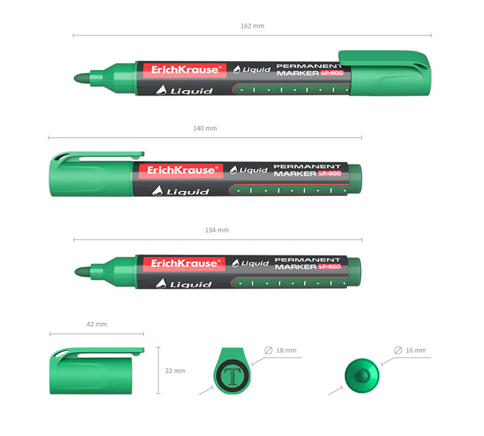 Перманентный маркер с жидкими чернилами и наконечником пулевидной формы. Предназначен для письма на любой поверхности: бумага, картон, стекло, пластик, фарфор, дерево и др. Имеет увеличенный запас чернил за счет технологии Free Ink. Имеет круглую форму корпуса, цветной колпачок и прозрачное окно для проверки уровня чернил. Цвет колпачка соответствует цвету чернил. Наконечник устойчивый к повреждению и истиранию. Толщина линии письма – 2.25 мм. Чернила на спиртовой основе, водоcтойкие, светостойкие, стойкие к ультрафиолетовым лучам, быстро высыхают после нанесения. Не токсичны. Не содержат ксилол, толуол. Срок годности 5 лет. Максимальная длина непрерывной линии 1000 м.