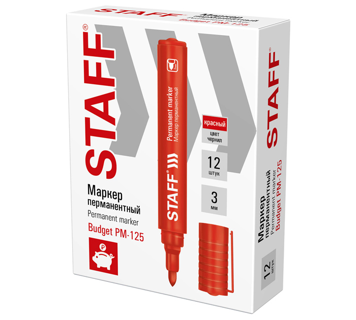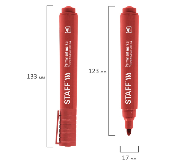 Перманентный маркер STAFF «Basic Budget PM-125» отлично подходит для повседневного использования. Предназначен для письма на любой поверхности: бумага, полиэтилен, дерево, стекло, металл, натуральная кожа, ткань, камень, плитка. Маркер перманентный красного цвета обладает круглым корпусом, диаметр которого 17 мм и длина 133 мм. Толщина линии письма - 3 мм. Особая нестираемая основа перманентного маркера обеспечивает такие качества, как стойкость к воздействию воды, низких и высоких температур. Благодаря спиртовой основе чернила быстро сохнут и не размазываются. Износостойкий наконечник устойчив к повреждениям и обеспечивает экономный расход чернил. Изделие не перезаправляется. Плотный колпачок с клипом предотвращает высыхание наконечника и чернил. Цвет корпуса и колпачка соответствует цвету чернил.Это товар эконом-сегмента, поэтому он отличается привлекательной ценой. Товар обладает базовым набором характеристик и простой упаковкой, при этом полностью соответствует основным требованиям потребителей. Страна-производитель - Китай