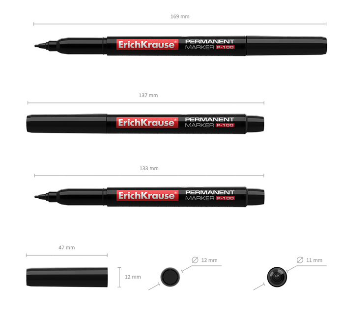 Универсальный тонкий перманентный маркер. Предназначен для письма и маркировки практически на всех поверхностях: бумага, картон, стекло, пластик, фарфор, керамика, дерево и др. Имеет круглую форму корпуса и цветной колпачок. Цвет колпачка и заглушки соответствует цвету чернил. Наконечник пулевидной формы устойчив к повреждению и истиранию. Толщина линии письма – 1 мм. Чернила на спиртовой основе, водоcтойкие, светостойкие, устойчивые к ультрафиолетовым лучам, быстро высыхают после нанесения. Нетоксичные. Не содержат ксилол, толуол. Срок годности 5 лет.
