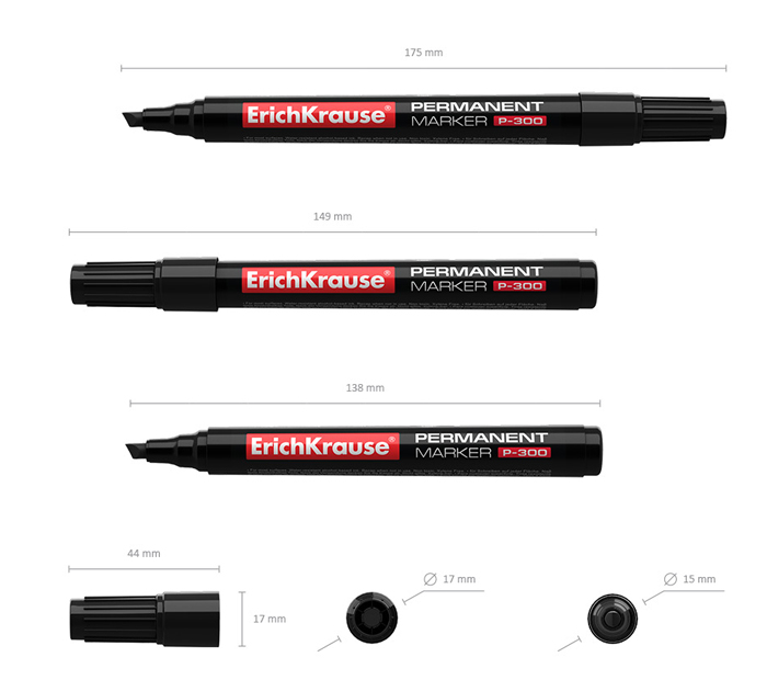 Перманентный маркер с наконечником скошенной формы. Предназначен для письма и маркировки практически на всех поверхностях: бумага, картон, стекло, пластик, фарфор, дерево и др. Имеет круглую форму корпуса и цветной колпачок. Цвет колпачка соответствует цвету чернил. Наконечник устойчив к повреждению и истиранию. Толщина линии письма – 0.5-4.5 мм. Чернила на спиртовой основе, водоcтойкие, светостойкие, устойчивые к ультрафиолетовым лучам, быстро высыхают после нанесения. Нетоксичные. Не содержат ксилол, толуол. Срок годности 5 лет.