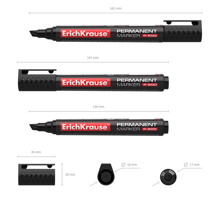 Перманентный перезаправляемый маркер с наконечником скошенной формы. Предназначен для письма и маркировки практически на всех поверхностях: бумага, картон, стекло, пластик, фарфор, дерево и др. Имеет круглую форму корпуса и цветной колпачок с клипом. Цвет колпачка соответствует цвету чернил. Наконечник устойчив к повреждению и истиранию. Толщина линии письма – 0.5-4.6 мм. Чернила на спиртовой основе, водостойкие, светостойкие, устойчивые к ультрафиолетовым лучам, быстро высыхают после нанесения. Нетоксичные. Не содержат ксилол, толуол. Срок годности 5 лет.