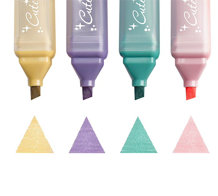 Набор текстовыделителей MeShu Shiny включает в себя 4 цвета с блестками. Эти оттенки придают вашим заметкам, скетчам или подчёркиваниям особый шарм и элегантность. А блёстки добавляют игривости и оригинальности, делая каждое выделенное слово или предложение более привлекательным. Они не покрывают поверхность бумаги плотным слоем, но в то же время хорошо выделяют наиболее значимые фрагменты текста. Маркеры обладают прямоугольными матовыми корпусамм, которые удобно лежат в руке, не скатываются с рабочего стола и легко помещаются в пенале. Скошенный наконечник обеспечивает возможность писать как тонкими линиями шириной 1 мм, так и делать более выразительные выделения шириной до 5 мм.