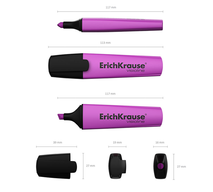 Текстмаркер предназначен для работы на всех типах бумаги, в том числе на бумаге для факсов и копировальных машин. Пишущий узел скошенной формы позволяет варьировать ширину письма. Широкая часть наконечника 5 мм удобна для выделения текста, а тонкая 0.6 мм – для подчеркивания. Цвет корпуса соответствует цвету чернил. Флуоресцентные чернила на водной основе быстро высыхают после нанесения и не оставляют следов на обратной стороне бумаги за счет тонкого и равномерного нанесения. Имеет узнаваемую запатентованную форму и стал абсолютным бестселлером в ассортименте текстмаркеров ErichKrause более чем в пятидесяти странах мира. Срок годности 5 лет.