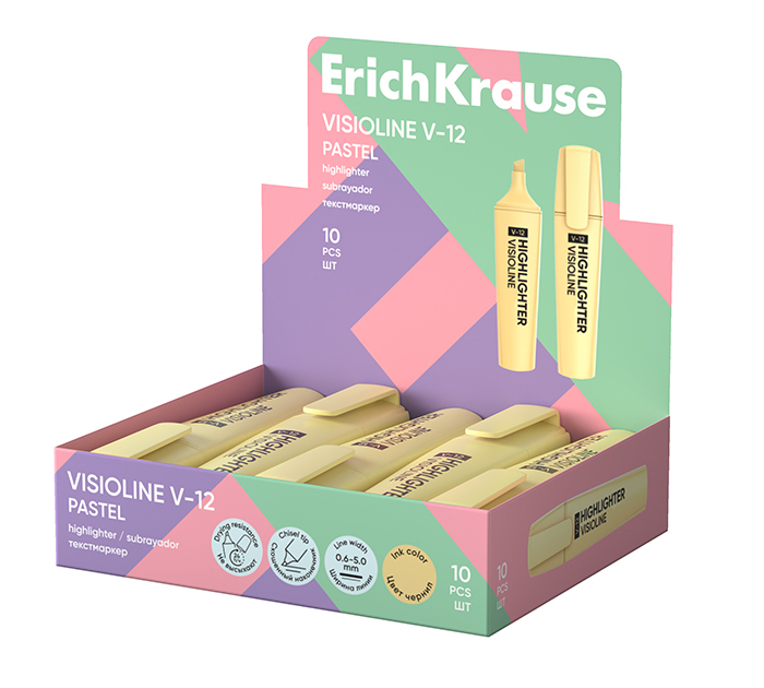 Текстовыделитель удобного формата популярной серии Visioline с чернилами нежных пастельных тонов. Благодаря своей узнаваемой запатентованной форме, маркер является бестселлером среди текстовыделителей Erich Krause более чем в 50 странах. Предназначен для работы на всех типах бумаги, в том числе на бумаге для факсов и копировальных машин. Пишущий узел скошенной формы позволяет варьировать ширину письма. Широкая часть наконечника 5.0 мм удобна для выделения текста, а тонкая 0.6 мм – для подчёркивания. Цвет колпачка соответствует цвету чернил. Чернила на водной основе быстро высыхают после нанесения и не оставляют следов на обратной стороне бумаги за счёт тонкого и равномерного нанесения. Благодаря специальной формуле, используемой для чернил, маркер не высыхает без колпачка в течение 24 часов. Срок годности составляет 5 лет.