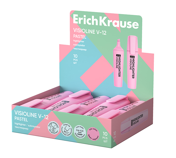 Текстовыделитель удобного формата популярной серии Visioline с чернилами нежных пастельных тонов. Благодаря своей узнаваемой запатентованной форме, маркер является бестселлером среди текстовыделителей Erich Krause более чем в 50 странах. Предназначен для работы на всех типах бумаги, в том числе на бумаге для факсов и копировальных машин. Пишущий узел скошенной формы позволяет варьировать ширину письма. Широкая часть наконечника 5.0 мм удобна для выделения текста, а тонкая 0.6 мм – для подчёркивания. Цвет колпачка соответствует цвету чернил. Чернила на водной основе быстро высыхают после нанесения и не оставляют следов на обратной стороне бумаги за счёт тонкого и равномерного нанесения. Благодаря специальной формуле, используемой для чернил, маркер не высыхает без колпачка в течение 24 часов. Срок годности составляет 5 лет.