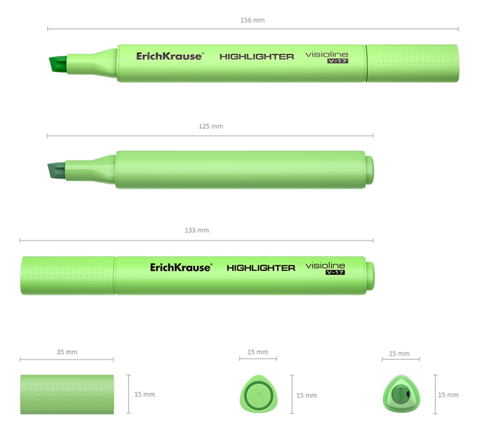 Текстмаркер эргономичной трехгранной формы с чернилами пастельных тонов. Предназначен для работы на всех типах бумаги, в том числе на бумаге для факсов и копировальных машин. Пишущий узел скошенной формы позволяет варьировать ширину письма. Широкая часть наконечника 4.5 мм удобна для выделения текста, а тонкая 0.6 мм – для подчеркивания. Цвет корпуса соответствует цвету чернил. Чернила на водной основе быстро высыхают после нанесения и не оставляют следов на обратной стороне бумаги за счет тонкого и равномерного нанесения. Срок годности 5 лет.