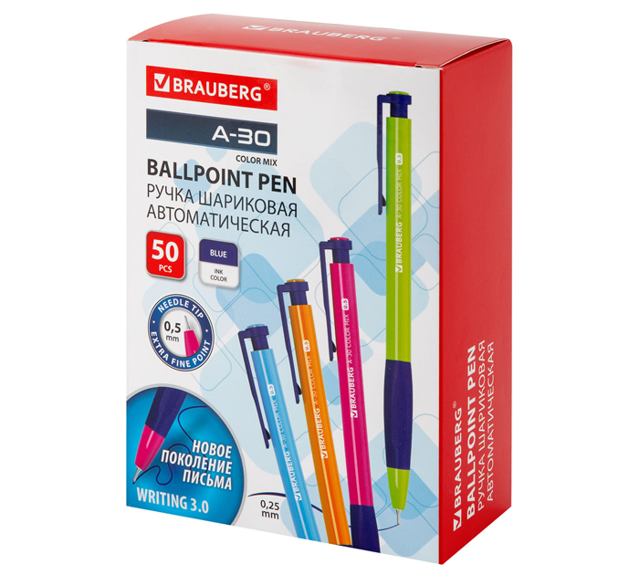 Автоматическая шариковая ручка BRAUBERG A-30 – для ультрамягкого, комфортного письма. Комфортному письму способствует эргономичный упор для пальцев. Данная ручка станет ваши незаменимым помощником в работе и учебе. Автоматическая шариковая ручка BRAUBERG A-30 представлена в 4 ярких неоновых цветах корпуса: желтый, розовый, оранжевый, голубой. Удобная прорезиненная зона захвата обеспечивает идеальный контроль и максимальный комфорт даже при самых сложных задачах! Диаметр пишущего узла 0,5 мм создает ровную линию письма, равную 0,25 мм. Страна-производитель - Китай.