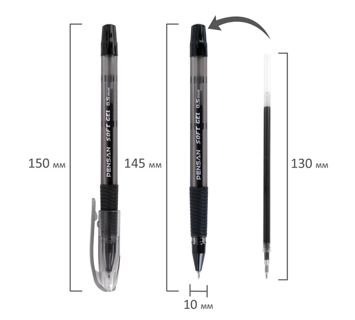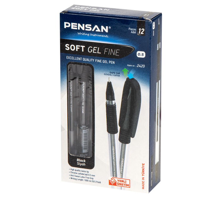 Гелевая ручка PENSAN «Soft Gel Fine» поставляется в классическом пластиковом тонированном корпусе круглой формы с деталями в цвет чернил. Зона захвата снабжена резиновым грипом в цвет чернил, которая обеспечит комфорт кисти при письме и позволит не прикладывать дополнительных усилий.В ручках серии «Soft Gel Fine» используется качественный наконечник, произведенный в Швейцарии, с пишущим узлом 0,5 мм с шариком из карбида вольфрама. Чернила высокого качества в совокупности с игольчатым наконечником обеспечат аккуратную линию письма без пропусков толщиной 0,4 мм. Стержень заменяем., страна-производитель - Турция