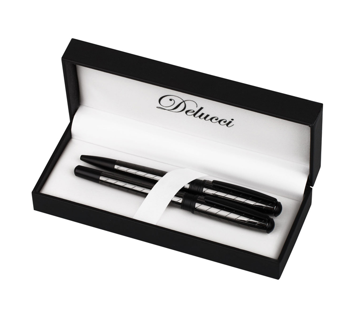 Набор Delucci Marte – подарок для настоящих ценителей. Стиль, качество и элегантность линейки подарочных ручек Delucci Marte в одном футляре. Черный глянцевый корпус в сочетании с черными матовыми элементами оригинально дополняет гравировка из симметрично изогнутых линий по всей длине корпуса. Клип сделан из нержавеющей стали, он позволяет фиксировать ручки на ежедневниках, блокнотах и карманах одежды. Шариковая ручка из набора Delucci Marte оснащена поворотным механизмом, внутри которого расположен пишущий стержень диаметром 1 мм, который идеально подходит для быстрого стиля письма. Особенностью ручки-роллера является специально изогнутая зона захвата, которая делает её не только привлекательной внешне, но и максимально удобной в использовании.Упакованы в кожаный футляр.