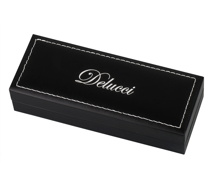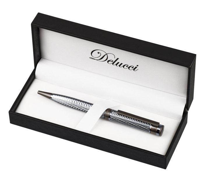 Delucci Stellato – это роскошь и стиль в одной ручке. Глянцевый корпус, волнообразный узор которого переливается благородным серебром, сразу привлечет к себе внимание и не оставит равнодушными даже самых притязательных. Хромированные элементы корпуса восстанавливают баланс строгости и стиля. Клип сделан из нержавеющей стали, он позволяет фиксировать ручку на ежедневниках, блокнотах и карманах одежды. Delucci Stellato оснащена поворотным механизмом, внутри которого расположен пишущий стержень диаметром 1 мм, который идеально подходит для быстрого стиля письма. Упакована в кожаный футляр.