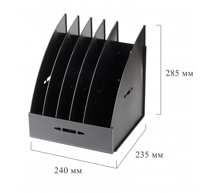 Лоток для бумаг на 5 отделений. Изготовлен из высококачественного полистирола черного цвета. Отлично подходит для журналов и бумаг формата А4 с открывающейся передней стенкой. Размеры: 240х235х285 мм. Сборная конструкция, имеется возможность регулировки ширины отделений.