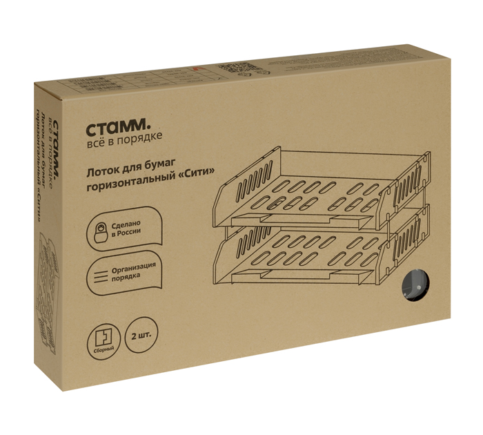 Набор из 2-х горизонтальных лотков для бумаг «СТАММ» серии «Сити» предназначен для хранения и систематизации бумажной продукции формата А4. Широкая загрузка во фронтальной части лотков облегчает изъятие документов. Прочный, устойчивый, вместительный корпус выполнен в прозрачном цвете. Лотки надёжно фиксируются друг на друге металлическими стержнями. Изделие высотой 154мм, глубиной 232мм и шириной 334мм изготовлено из качественного пластика. Вмещает до 700 листов. Набор упакован в термоусадочную пленку. Поставляется в разобранном виде.Страна-производитель - РОССИЯ