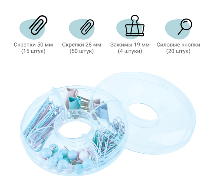 Набор канцелярских принадлежностей Meshu Dew включает в себя: зажимы 19 мм (4 штуки), скрепки с виниловым покрытием 28 мм (50 штук), скрепки с виниловым покрытием 50 мм (15 штук), силовые кнопки (20 штук). Выполнен в цветовой гамме нежных пастельных цветов (мятный, розовый и голубой). Все элементы упакованы в стильный пластиковый пенал с удобным замком и отделениями для каждого вида товара, который идеально подойдет для хранения принадлежностей. Упаковка набора - картонный подвес.