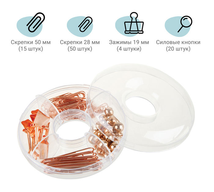 Набор канцелярских принадлежностей Meshu Rose Gold включает в себя: зажимы скрепки розовое золото 19 мм (4 штуки), скрепки розовое золото 28 мм (50 штук), скрепки скрепки розовое золото 50 мм (15 штук), силовые кнопки (20 штук). Все элементы упакованы в стильный пластиковый пенал с удобным замком и отделениями для каждого вида товара, который идеально подойдет для хранения принадлежностей. Упаковка набора - картонный подвес.