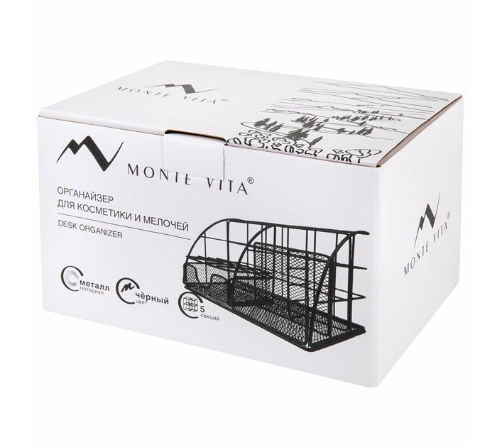 Металлический органайзер MONTE VITA – это стильное, практичное и долговечное решение для хранения канцелярских принадлежностей, мелких предметов, косметики и кистей для макияжа. Он с легкостью впишется в любой интерьер. Изготовлен из металлической сетки. Имеет размеры 140х220х127 мм. Состоит из пяти секций. Благодаря своему стильному дизайну, удобству использования и надежности, органайзер MONTE VITA станет незаменимым аксессуаром для вашего комфорта. Он обеспечит удобное хранение вашей канцелярии, косметики и прочих мелочей, а также легкий доступ к ним.