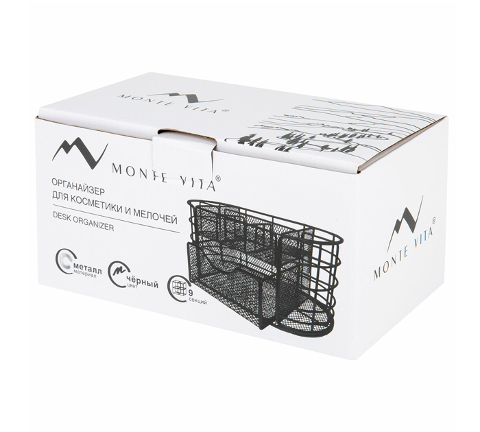 Металлический органайзер MONTE VITA – это стильное, практичное и долговечное решение для хранения канцелярских принадлежностей, мелких предметов, косметики и кистей для макияжа. Он с легкостью впишется в любой интерьер. Изготовлен из металлической сетки. Имеет размеры 105х218х110 мм. Состоит из девяти секций. Благодаря своему стильному дизайну, удобству использования и надежности, органайзер MONTE VITA станет незаменимым аксессуаром для вашего комфорта. Он обеспечит удобное хранение вашей канцелярии, косметики и прочих мелочей, а также легкий доступ к ним.