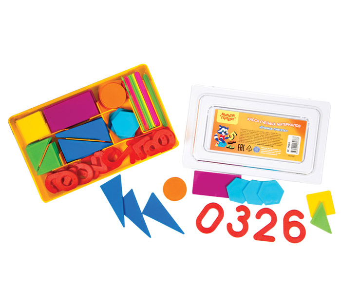 В состав кассы «Учись считать» входят: прямоугольник – 10 штук, квадрат – 10 штук, прямоугольный треугольник – 20 штук, равнобедренный треугольник – 20 штук, круг – 10 штук, шестиугольник – 10 штук, цифры от 0 до 9 – 2 комплекта (20 штук), математические знаки + – = < > (12 штук), счетные палочки – 20 штук. Общее количество элементов: 132 штуки. Для детей старше 3-х лет.