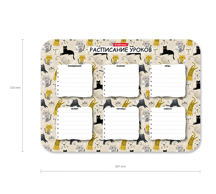 Расписание уроков формата А4 (210х297 мм) из высококачественного пластика. Поверхность подходит для многократного написания простыми и цветными карандашами, фломастерами, любыми не перманентными маркерами. Толщина пластика — 0.4 мм. Шестидневная учебная неделя, каждый день содержит строки для записи. Упаковка — индивидуальный пакет.
