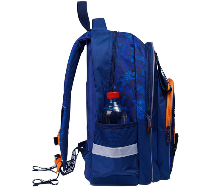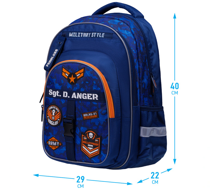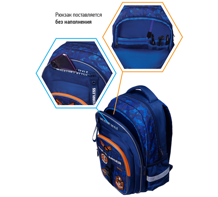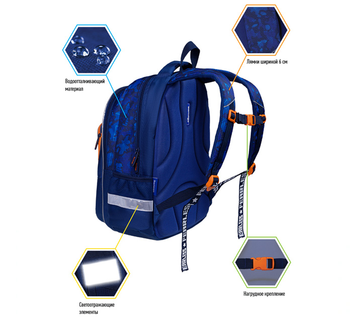 Эргономичный рюкзак предназначен для учеников начальной и средней школы и является отличной альтернативой жестким ранцам. Формованная спинка из экологичного ЭВА материала устойчива к деформации, создана с учетом анатомического строения спины ребенка, имеет вентиляционные каналы для свободной циркуляции воздуха. Плотные лямки с возможностью регулировки и нагрудный фиксатор позволяют равномерно распределить нагрузку на спину ребенка. В рюкзаке предусмотрены 2 отделения, 2 передних кармана, 2 боковых кармана, уплотненное дно с откидной пластиковой планкой. Внутри имеется органайзер и отделение для учебных пособий. Световозвращающие элементы расположены на лямках, спинке и боковых частях ранца.