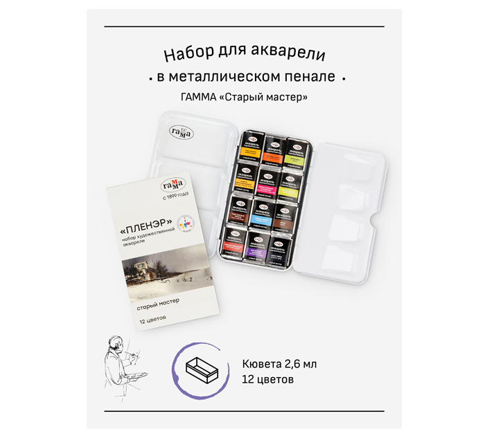 Акварель художественная (набор) Гамма «Старый мастер. Пленэр» 12 цветов, кюветы по 2.6мл, в металлическом пенале