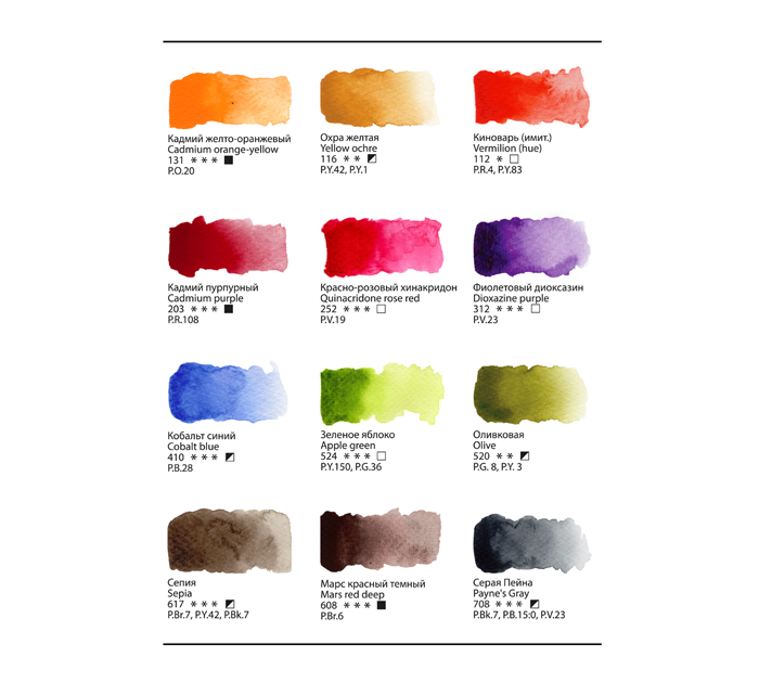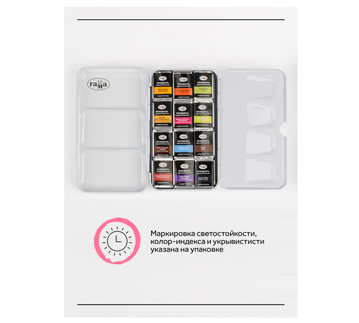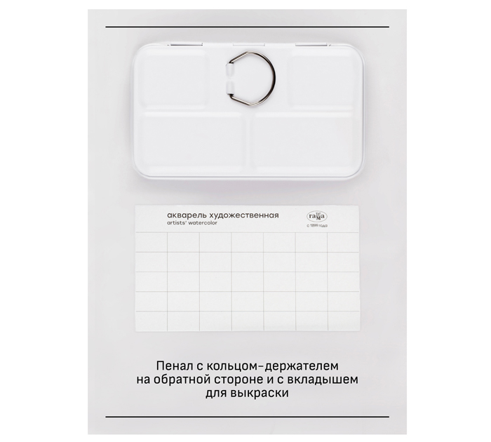 Набор акварельных красок ГАММА «Пленэр» в металлическом пенале состоит из 12 цветов акварели «Старый мастер» в кюветах 2,6 мл. Набор разработан совместно с IWS RUSSIA – российским филиалом Международного Акварельного Общества. Профессиональная акварель серии «Старый мастер» разработана в собственной исследовательской лаборатории завода. Краски изготовлены на основе органических и неорганических пигментов и гуммиарабика высшего качества. Цвета акварельных красок звонкие, чистые, прозрачные. Краски высокопигментированные, интенсивные, легко набираются на кисть. Маркировка светостойкости, колор-индекса и укрывистости указана на упаковке. Акварель отлично подойдет как профессионалам, так и начинающим художникам. Набор представлен в белом металлическом пенале с удобными креплениями кювет, палитрой и кольцом-держателем на обратной стороне. Такой формат удобен для пленэра или студии. Автор иллюстрации на упаковке – Татьяна Анисимова. Состав набора: 112 Киноварь (имит.); 116 Охра желтая; 131 Кадмий желто-оранжевый; 203 Кадмий пурпурный; 252 Красно-розовый хинакридон; 312 Фиолетовый диоксазин; 410 Кобальт синий; 520 Оливковая; 524 Зеленое яблоко; 608 Марс красный темный; 617 Сепия; 708 Серая Пейна.