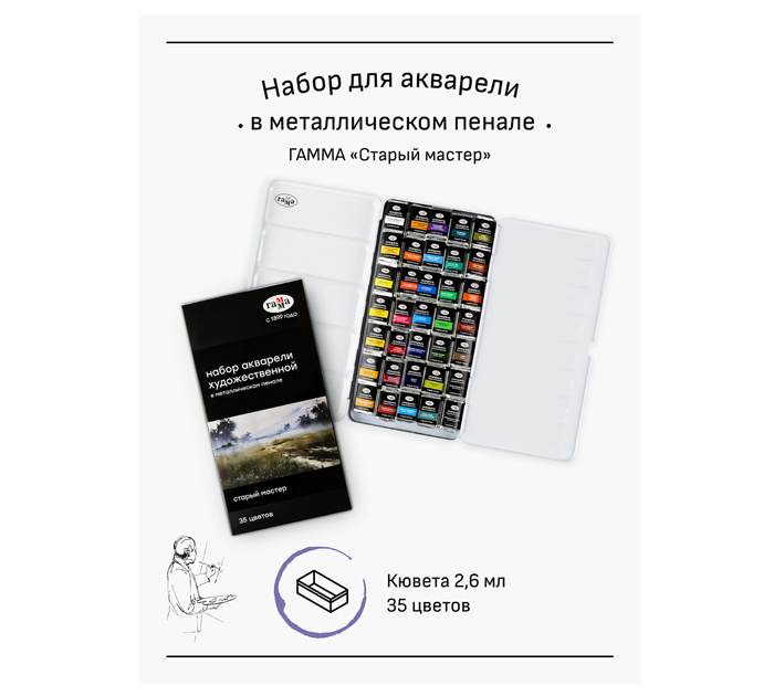 Акварель художественная (набор) Гамма «Старый мастер» 35 цветов, кюветы по 2.6мл, в металлическом пенале