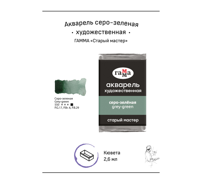 Профессиональная художественная акварель «ГАММА» серии «Старый мастер» упакована в новую кювету объёмом 2,6 мл. Цвет краски – серо-зелёный. Рецептура профессиональной художественной акварели «Старый мастер» разработана в собственной исследовательской лаборатории завода. В составе красок гуммиарабик высшей степени очистки и высококачественные пигменты, которые обеспечивают насыщенность цветов, чистоту и прозрачность красочного слоя. Каждая кювета упакована в плёнку.