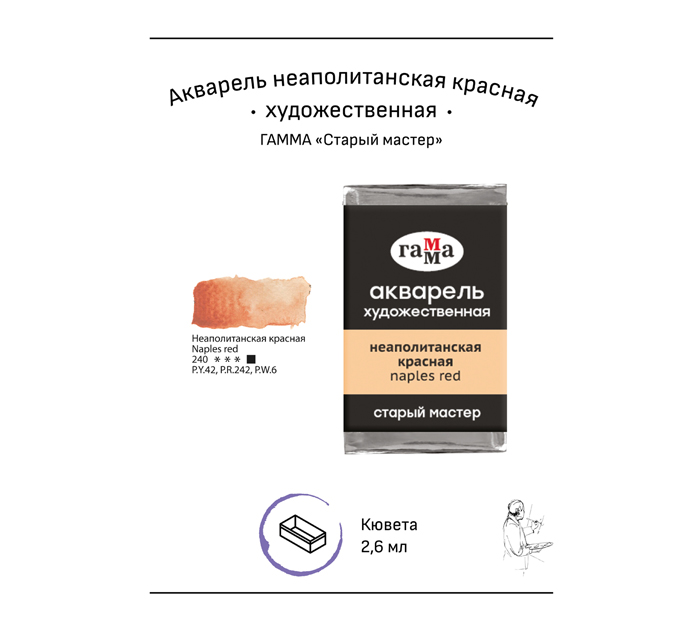 Профессиональная художественная акварель «ГАММА» серии «Старый мастер» в новой эргономичной кювете, объём - 2,6 мл, цвет – неаполитанский красный. Профессиональная художественная акварель «ГАММА» в кюветах серии «Старый мастер» разработана в собственной исследовательской лаборатории завода совместно с профессиональными художниками. В составе красок гуммиарабик высшей степени очистки и высококачественные пигменты, которые обеспечивают насыщенность цветов, чистоту и прозрачность красочного слоя. Все цвета отлично смешиваются между собой, позволяя создавать новые оттенки. Обновлённая форма кюветы более эргономична и удобна для использования.
