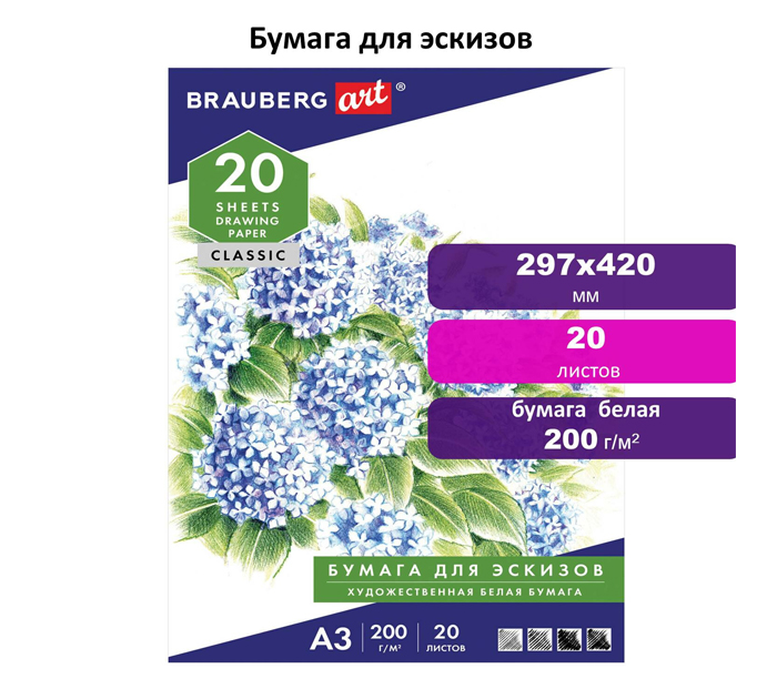 Папка содержит плотные, гладкие листы, хорошо подходящие именно для сухих техник (карандаши, фломастеры, графитные мелки, линеры и тд). Подойдет и для маркеров, но нужно будет подкладывать что-то под лист, на котором рисуете. Содержит 20 листов плотностью 200 г/м2 формата А3 (297х420 мм). Листы из качественной офсетной бумаги устойчивы к истиранию. Обложка выполнена из импортного мелованного картона. Бумага для рисования BRAUBERG - это основа для создания красочных работ. Спешите приобрести товары для первых творческих шагов в нашем интернет-магазине!
