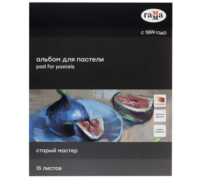 Альбом для пастели ГАММА серии «Старый мастер» размером 250х300 мм состоит из 15 листов плотностью 160 г/м2 на склейке. В блоке 5 цветов в тёплых тонах. Бумага изготовлена в Европе из 100% целлюлозы изготовлена без использования кислот и отбеливателей. Альбомы для пастели имеют ячеистую структуру бумаги, благодаря которой пастель хорошо ложится на бумагу, легко растушёвывается и практически не осыпается. Альбом отлично подойдёт для пастели, угля и других мягких материалов.