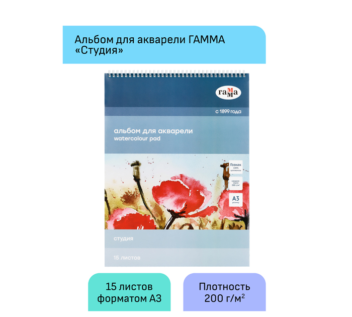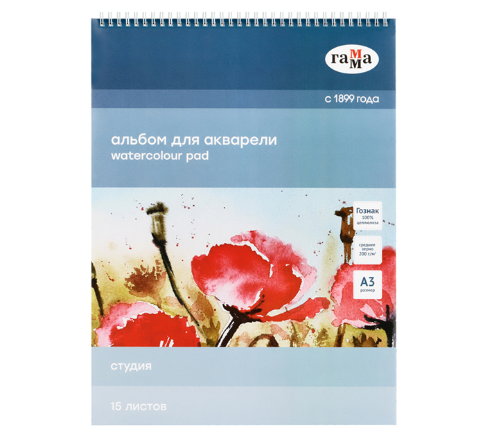 Альбом для акварели Гамма "Студия" А3, 200 г/м², 15л, среднее зерно, на спирали