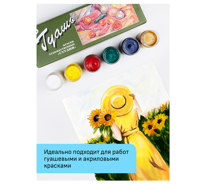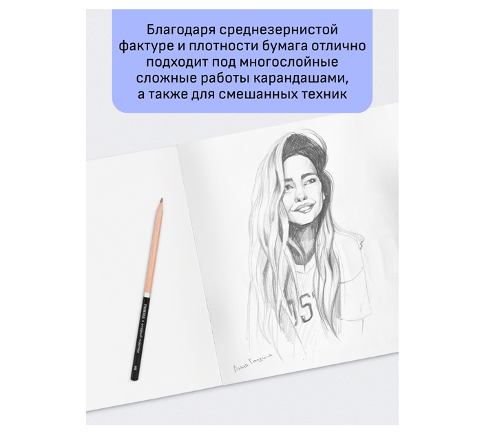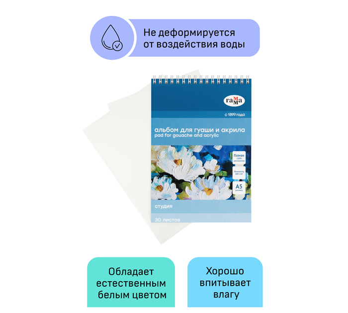 Альбомы Гамма «Студия» предназначен для работ гуашевыми красками, акриловыми, а также темперой. Бумага изготовлена на Гознаке из 100% целлюлозы, плотностью 180 г/м2. Гладкая по обеим сторонам. Обладает высокой степенью адгезии и не требует дополнительной подготовки. Альбомы брошюрованы спиралью по короткой стороне. Последняя страница альбома представляет собой твердую подложку, служащую в качестве планшета. Можно использовать на пленере.