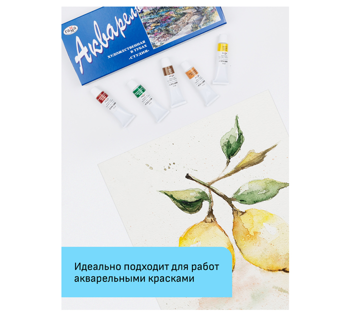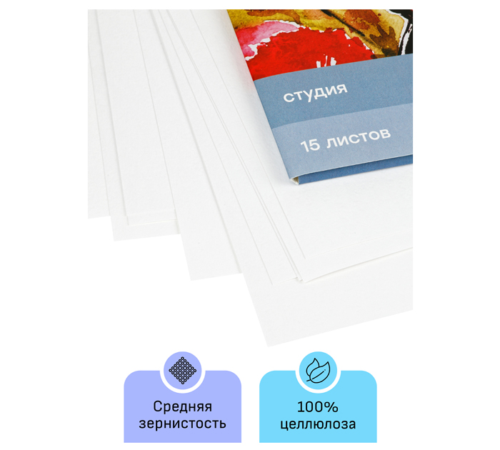 Папка для акварели ГАММА серии «Студия» формата А4 (205х296 мм) плотностью 200 г/м2 средней зернистости, марки А. В папке 15 листов, изготовленных из 100% целлюлозы на заводе «Гознак» без использования оптических отбеливателей. Бумага обладает естественным белым цветом, идеально подходит для водных техник, хорошо впитывает влагу, не деформируется от воздействия воды. Благодаря среднезернистой фактуре и плотности она отлично подходит под многослойные сложные работы карандашами, а также для смешанных техник. Папка представлена в картонной обложке.