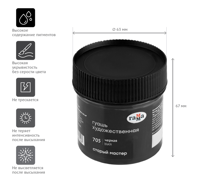 Гуашь художественная «Гамма» серии «Старый мастер» имеет уникальную рецептуру, разработанную в собственной исследовательской лаборатории завода совместно с художниками. Краски изготавливается из тонкодиспесных пигментов, связующего, в состав которого входит раствор растительного клея - гуммиарабика высшей степени очистки. Краска легко наносится на поверхность, благодаря специальным добавкам сохраняет яркость цвета после высыхания, создавая плотный бархатистый слой. Гуашь обладает высокой укрывистостью, отличной разносимостью, а также хорошо смешивается между собой. Большая часть цветов имеет самый высокий показатель светостойкости. Страна-производитель - РОССИЯ.
