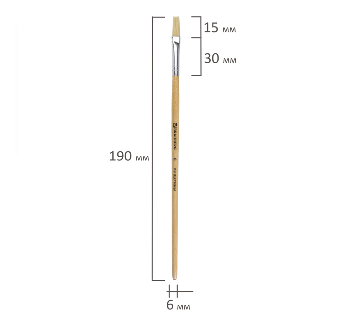 Кисть BRAUBERG № 6 подходит для работы с гуашью, акрилом, маслом, темперой, а также для прорисовывания различных деталей рисунка. Снабжена защитным пластиковым колпачком. Кисть из щетины обладает высокой упругостью, хорошо держит форму, долговечна и надежна. Кисть № 6 позволит прорисовывать детали и наносить крупные мазки и линии. Деревянную лакированную рукоятку кисти удобно держать в руке., страна-производитель - Китай
