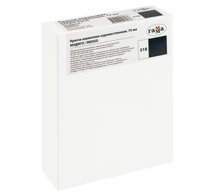Акриловая краска ГАММА «Студия» предназначена для художественно-живописных и декоративно-прикладных работ. Цвет — индиго. Объём пластиковой тубы — 75 мл. Акрил ГАММА отличается насыщенным цветом, густой консистенцией, высокой адгезией, прочностью красочного слоя. После высыхания краска становится глянцевой, практически не темнеет, специальная добавка позволяет максимально раскрыть красоту цвета. Художественный акрил прекрасно разносится и подходит для бумаги, картона, грунтованного холста, дерева, стекла, кожи, ткани. Время высыхания: от 10 минут до 1 часа в зависимости от толщины слоя. Прозрачный корпус тубы позволяет увидеть цвета красок, а удобная крышка флип-топ предотвращает высыхание. Страна-производитель - РОССИЯ.