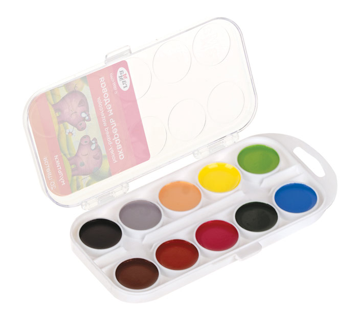 Медовая акварель ГАММА серии «Мультики» разработана с учетом рекомендаций педагогов, идеально подходит для занятий рисованием в детском саду, школе и дома. Яркие чистые цвета развивают фантазию и интерес к творчеству. Удобный пластиковый пенал: крышка служит палитрой для смешивания красок, кюветы с высокими бортиками и увеличенным расстоянием между красками не позволяют цветам смешиваться в подложке во время рисования. Акварель легко смывается с рук и отстирывается с одежды. Набор 20 цветов в пластиковой подложке, без кисти. Форма кюветы: круглая. Объём кюветы: 3,5 см3. Страна-производитель - РОССИЯ.