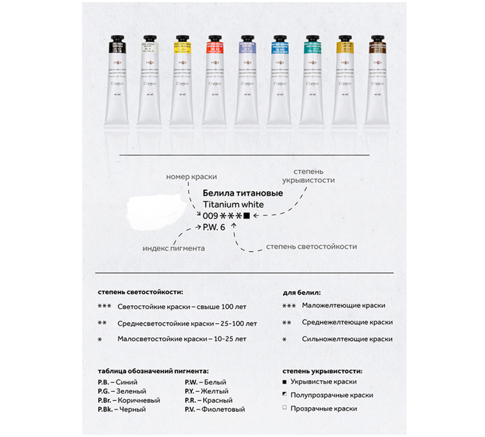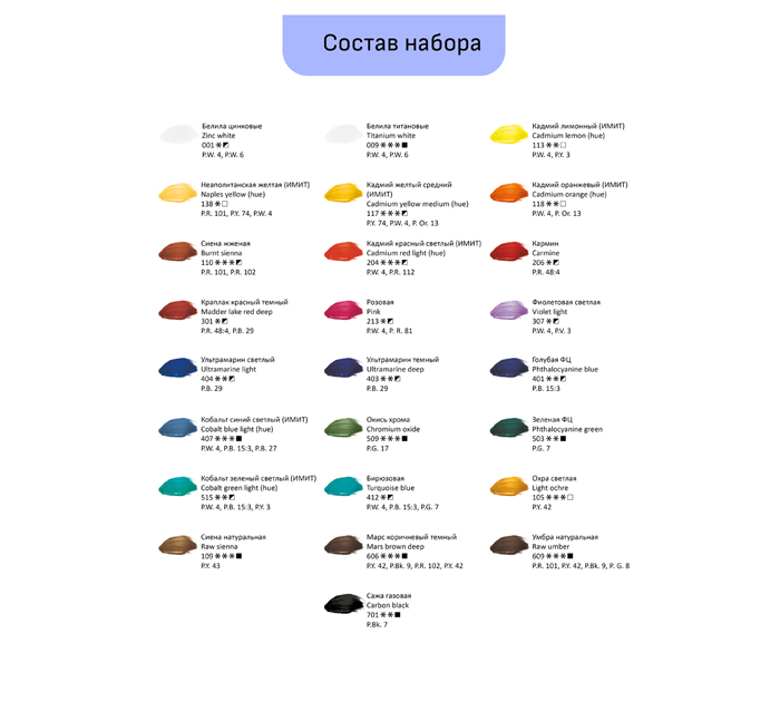 Масляные краски серии «Студия» не уступают тонкотёртым масляным краскам по степени перетира, пастозности и светостойкости. Краски экологически безопасны благодаря имитациям кадмиево-кобальтовой группы пигментов. Они идеальны для начинающих художников и студентов художественных училищ. В набор входят 9 цветов в алюминиевых тубах. Объём одной тубы — 46 мл, общий объём — 414 мл. Состав набора: 001 Белила цинковые 105 Охра светлая 119 Кадмий желтый средний имит. 204 Кадмий красный светлый имит. 307 Фиолетовая светлая 407 Кобальт синий светлый имит. 511 Хром-кобальт зелено-голубой имит. 613 Марс коричневый темный имит. 701 Сажа газовая