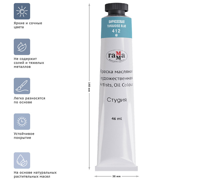 Масляные краски «Гамма» серии «Студия» изготавливаются из льняного масла, органических и неорганических пигментов. Кадмиево- кобальтовая группа заменена имитацией, что делает краски безопасными. Также в состав красок входит пчелиный воск, он придает краскам пастозную консистенцию и предотвращает от растрескивания после высыхания. Цветовой диапазон включает в себя как укрывистые краски, так и прозрачные. Масляные краски подходят для обучения и начинающих художников. Страна-производитель - РОССИЯ.