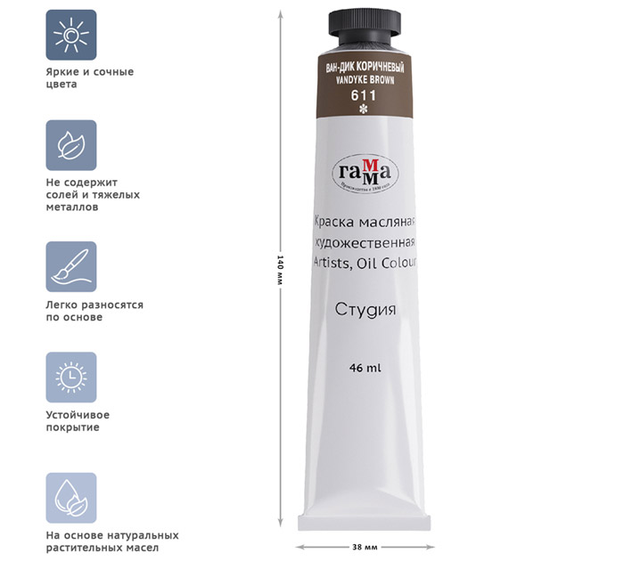 Масляные краски «Гамма» серии «Студия» изготавливаются из льняного масла, органических и неорганических пигментов. Кадмиево- кобальтовая группа заменена имитацией, что делает краски безопасными. Также в состав красок входит пчелиный воск, он придает краскам пастозную консистенцию и предотвращает от растрескивания после высыхания. Цветовой диапазон включает в себя как укрывистые краски, так и прозрачные. Масляные краски подходят для обучения и начинающих художников. Страна-производитель - РОССИЯ.