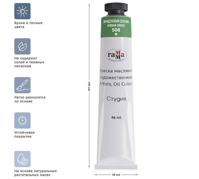 Масляные краски «Гамма» серии «Студия» изготавливаются из льняного масла, органических и неорганических пигментов. Кадмиево- кобальтовая группа заменена имитацией, что делает краски безопасными. Также в состав красок входит пчелиный воск, он придает краскам пастозную консистенцию и предотвращает от растрескивания после высыхания. Цветовой диапазон включает в себя как укрывистые краски, так и прозрачные. Масляные краски подходят для обучения и начинающих художников. Страна-производитель - РОССИЯ.