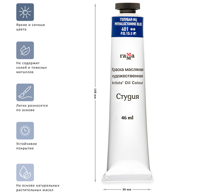 Масляные краски «Гамма» серии «Студия» изготавливаются из льняного масла, органических и неорганических пигментов. Кадмиево- кобальтовая группа заменена имитацией, что делает краски безопасными. Также в состав красок входит пчелиный воск, он придает краскам пастозную консистенцию и предотвращает от растрескивания после высыхания. Цветовой диапазон включает в себя как укрывистые краски, так и прозрачные. Масляные краски подходят для обучения и начинающих художников. Страна-производитель - РОССИЯ.
