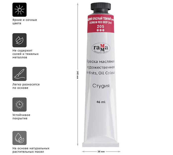 Масляные краски «Гамма» серии «Студия» изготавливаются из льняного масла, органических и неорганических пигментов. Кадмиево- кобальтовая группа заменена имитацией, что делает краски безопасными. Также в состав красок входит пчелиный воск, он придает краскам пастозную консистенцию и предотвращает от растрескивания после высыхания. Цветовой диапазон включает в себя как укрывистые краски, так и прозрачные. Масляные краски подходят для обучения и начинающих художников. Страна-производитель - РОССИЯ.