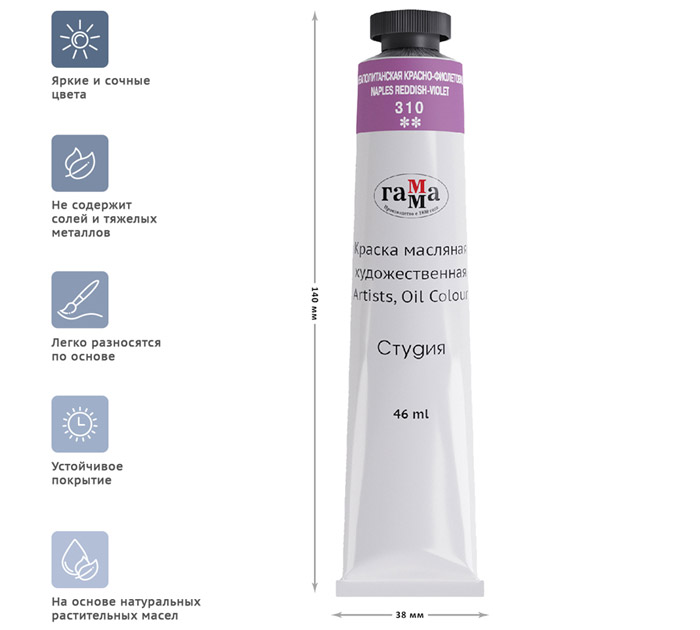 Масляные краски «Гамма» серии «Студия» изготавливаются из льняного масла, органических и неорганических пигментов. Кадмиево- кобальтовая группа заменена имитацией, что делает краски безопасными. Также в состав красок входит пчелиный воск, он придает краскам пастозную консистенцию и предотвращает от растрескивания после высыхания. Цветовой диапазон включает в себя как укрывистые краски, так и прозрачные. Масляные краски подходят для обучения и начинающих художников. Страна-производитель - РОССИЯ.