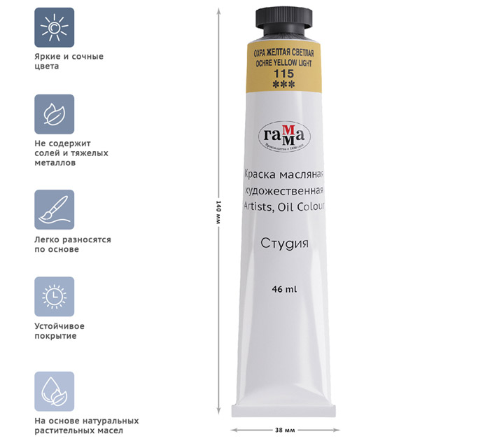 Масляные краски «Гамма» серии «Студия» изготавливаются из льняного масла, органических и неорганических пигментов. Кадмиево- кобальтовая группа заменена имитацией, что делает краски безопасными. Также в состав красок входит пчелиный воск, он придает краскам пастозную консистенцию и предотвращает от растрескивания после высыхания. Цветовой диапазон включает в себя как укрывистые краски, так и прозрачные. Масляные краски подходят для обучения и начинающих художников. Страна-производитель - РОССИЯ.